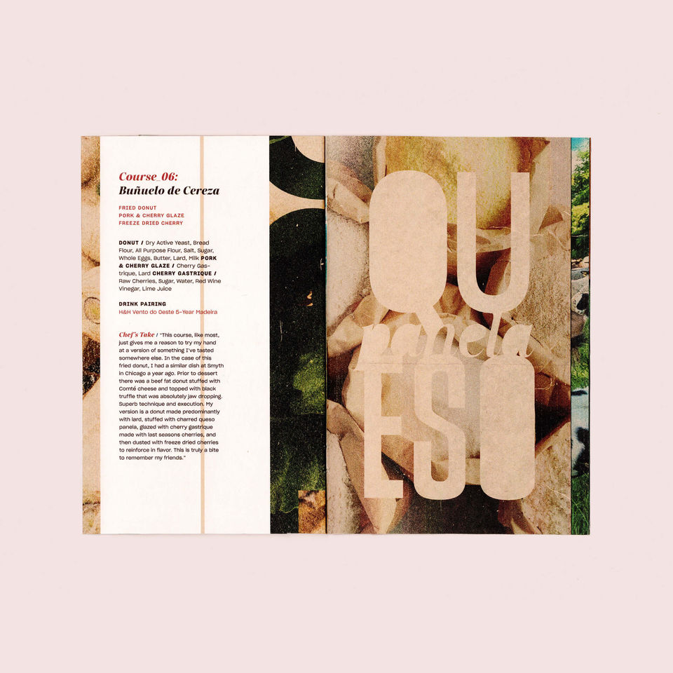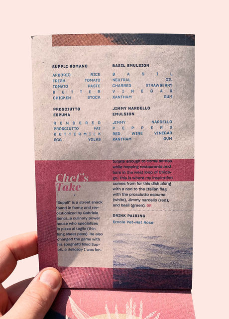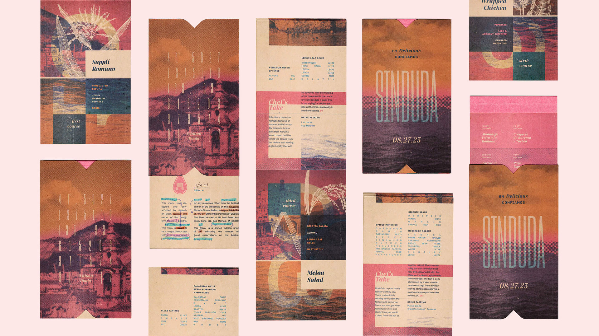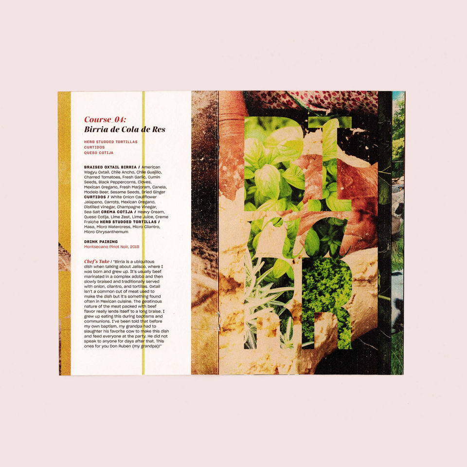 From the plants that yield grain used to create pasta to the rocky shores of Amalfi Beach, every image integrated into this menu design presents a connection to coastal Italy. Crisscrossing throughout the design structure is a color palette of blues, pinks and oranges...once again reinforcing time and place. The overall design of the menu helped to accentuate the natural wine used for the course pairings and the rustic but delicate recipes rolled out in front of each guest.